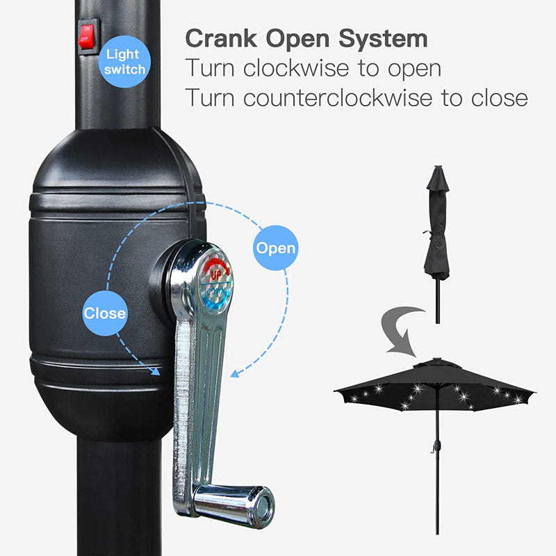 Perfect choice for daytime and night! Our beautiful lighted patio umbrella enables you to enjoy happy outdoor activities all day long. Made of high-quality 100% polyester, the broader canopy provides 1000 hours of UV protection and has an excellent waterproof function. The easy-to-use crank system makes the operation effortless. The push-button tilt design can adjust the shade to any desired angle. You can enjoy yourself from sunrise to sunset!