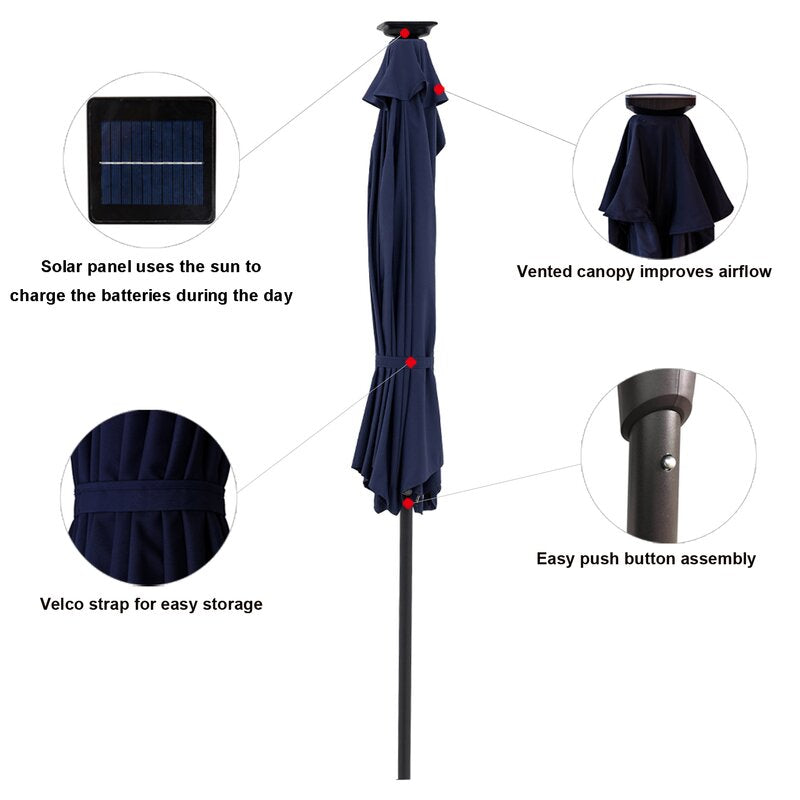 These 9 feet half-moon garden parasols with LED lights are manufactured using metal components. Prelit lights are powered by rechargeable batteries to provide terrific illumination in the evening. The canopy provides shade from UV exposure. Using a protective waterproof cover will help to minimize color fade caused by the sun. Open and close with a smooth crank winder and then engage the push button tilting function to adjust the angle of the shade, offering more shading options and safer all-day sun protection for your family.