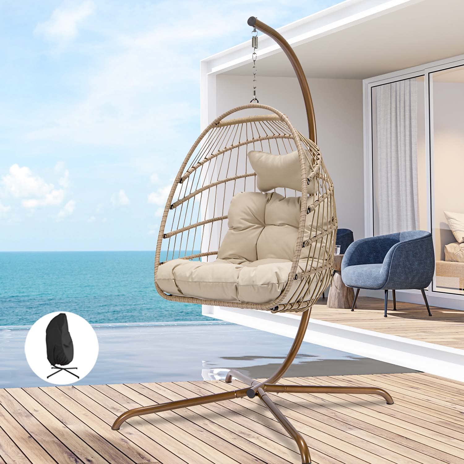 RADIATA Foldable Wicker Hanging Egg Chair With Stand and Cover,Maximum Weight 350 lbs