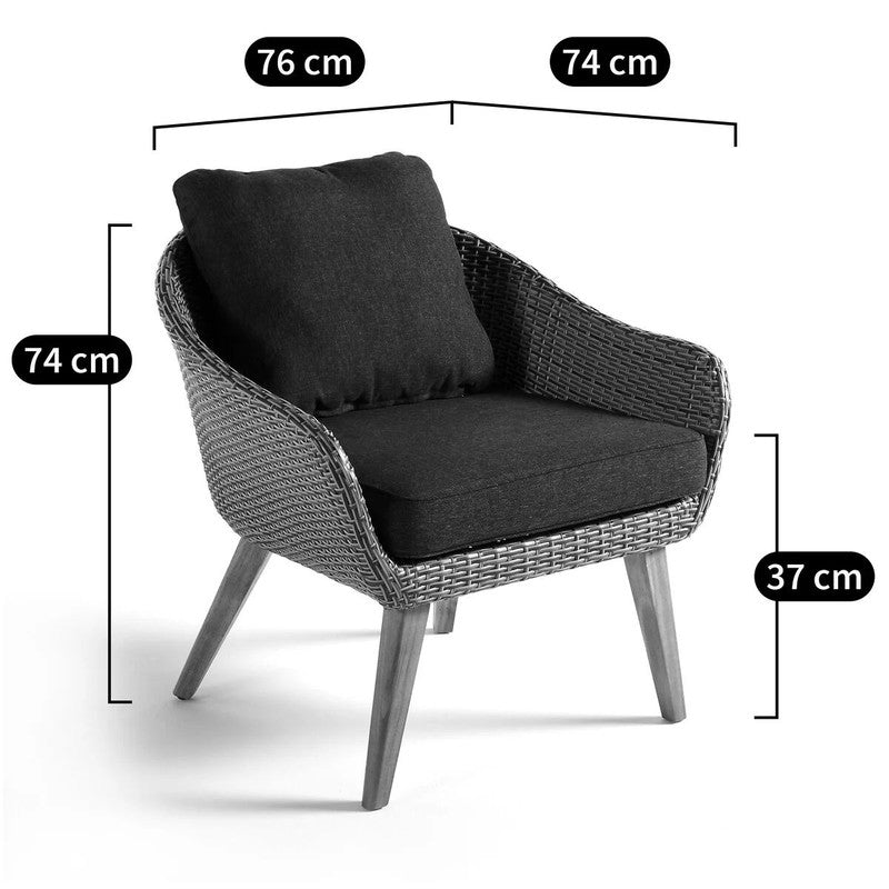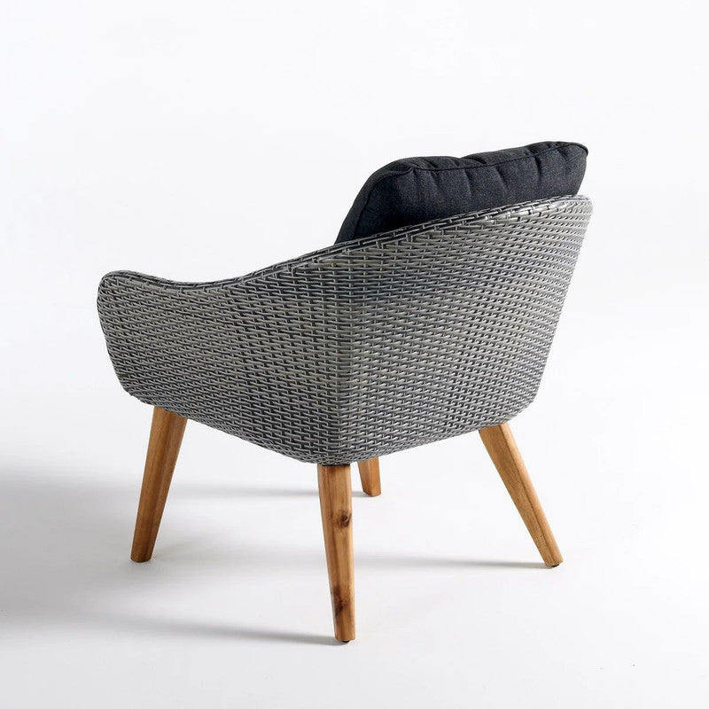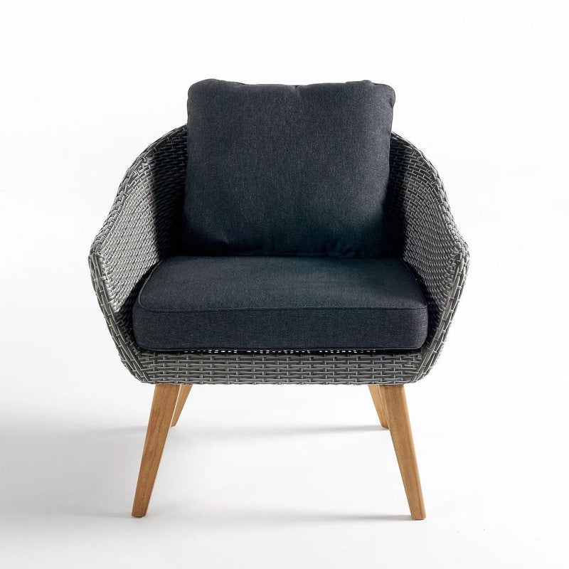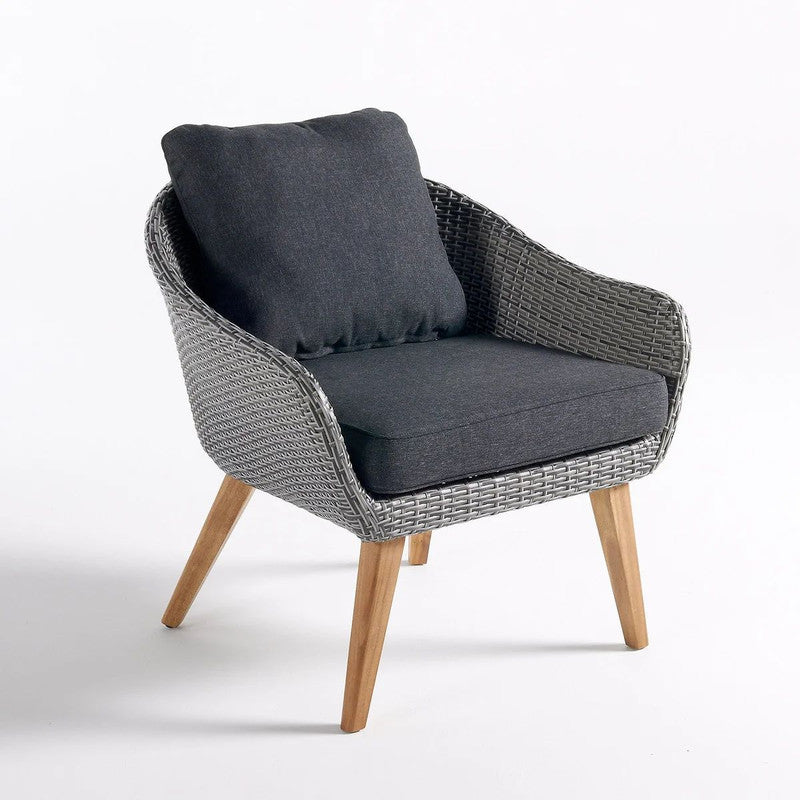 Introducing our gray outdoor eicker chair with wooden Legs. This stylish chair features a durable gray wicker construction, complemented by sturdy wooden legs for stability. With soft cushions for both the back and seat, it offers optimal comfort while lounging outdoors. Elevate your outdoor seating area with this elegant and cozy wicker chair.