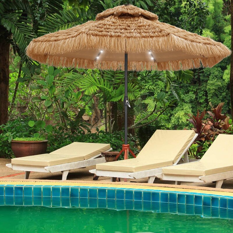 The round double-top Thatched umbrella provides maximum multi-position shade and sets up easily and opens quickly, so your outdoor living space will be cooled down on time. It can be waterproof, Anti-UV, and Windproof. When you on the night, open the switch, you can enjoy the lighting umbrella charm.